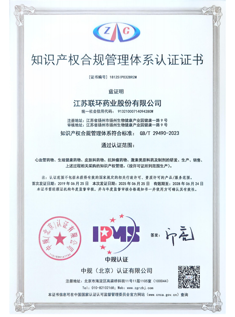 CopyRight ©2026  版權所有  江蘇聯環藥業股份有限公司   電話:0514-82778972 地址:揚州生物健康產業園健康一路9號